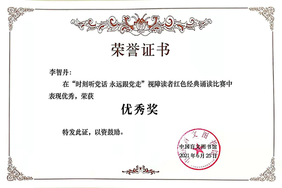 日前,由中國殘聯宣文部指導,中國盲協(xié)、中國盲文圖書館和中國盲文出版社共同主辦“時刻聽黨話 永遠跟黨走”視障讀者紅色經典誦讀比賽中,太湖盲人選手李智丹將對黨的祝福與感恩用激情洋溢、情感充沛的演講完美詮釋出來,最終榮獲優(yōu)秀獎。