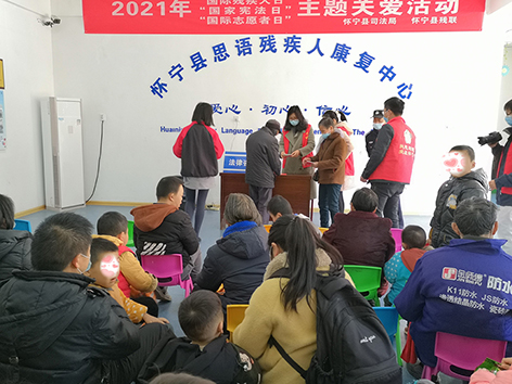 12月3日上午,在第30個(gè)“國(guó)際殘疾人日”來(lái)臨之際,為迎接“國(guó)家憲法日”、“國(guó)際志愿者日”的到來(lái),懷寧縣殘聯(lián)聯(lián)合縣司法局組織志愿者走進(jìn)懷寧縣思語(yǔ)殘疾兒童康復(fù)中心,開展助殘普法志愿服務(wù)活動(dòng)。