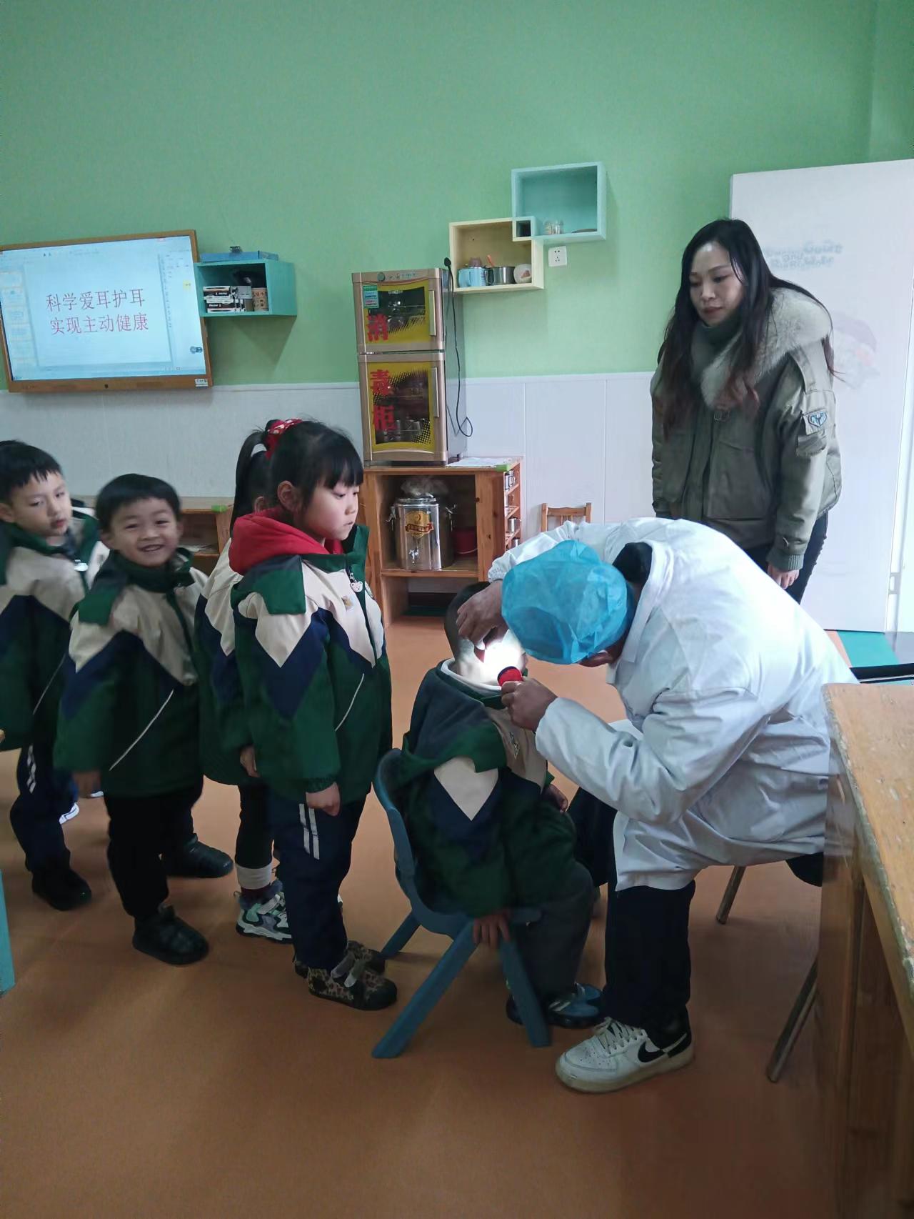 在幼兒園里醫(yī)護人員為小朋友講道:耳朵對人的重要性,不要去嘈雜的地方去,在噪聲大的環(huán)境中,要佩戴適當(dāng)?shù)亩只蚨浒l(fā)炎或耳鳴時,要及時告訴媽媽帶去看醫(yī)生,還有戴耳機時,音量不要太大以免耳膜受到傷害等等。小朋友們一個個聽著特別認(rèn)真并說道:“一定要聽醫(yī)生話,好好保護耳朵?!?