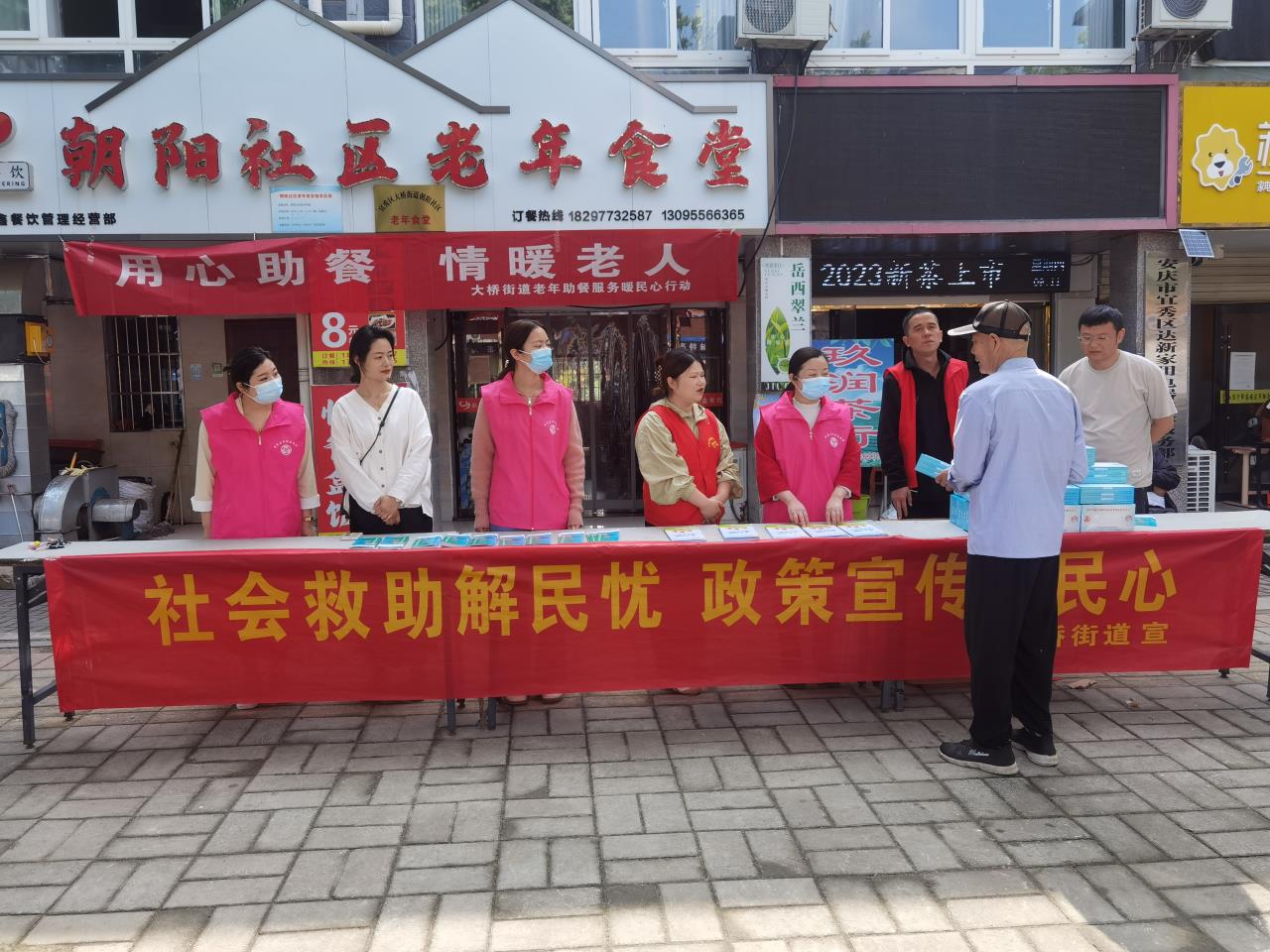 為進(jìn)一步做好社會(huì)救助政策宣傳工作,提高社會(huì)事務(wù)政策的普及度、知曉度和滿意度,增強(qiáng)群眾對(duì)社會(huì)救助政策的了解,5月25日上午,大橋街道殘聯(lián)、社會(huì)事務(wù)辦在朝陽(yáng)社區(qū)舉辦“社會(huì)救助解民憂政策宣傳”及“大橋街道老年助餐暖民心行動(dòng)”活動(dòng)。