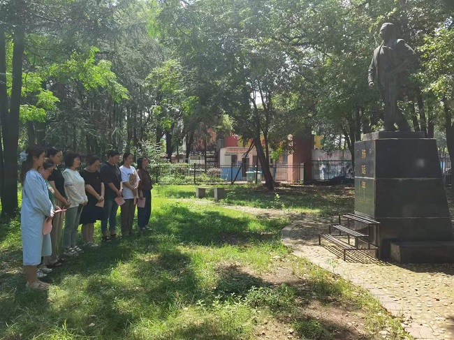 在青少年宮陳延年烈士雕像前,起點(diǎn)特殊教育學(xué)校黨支部全體黨員、積極分子整齊列隊(duì),莊嚴(yán)肅立,懷著對(duì)革命先烈的崇敬之情向烈士鞠躬、獻(xiàn)花。