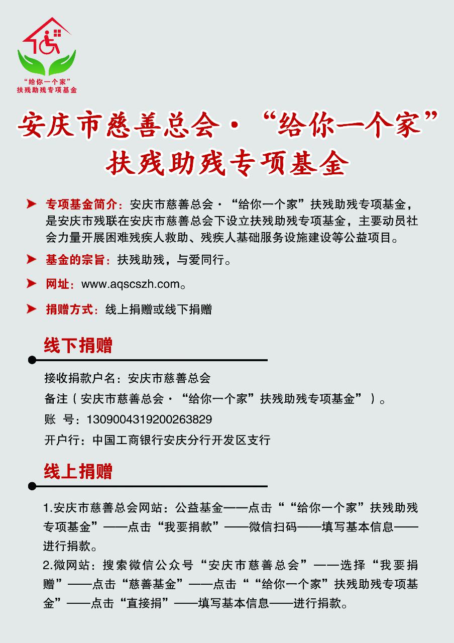 為發(fā)動(dòng)社會(huì)各界力量籌集更多資源,更好地為殘疾人服務(wù),由市殘聯(lián)和市慈善總會(huì)聯(lián)合發(fā)起并成立了“給你一個(gè)家”扶殘助殘專項(xiàng)基金,主要用于開展困難殘疾人救助、殘疾人基礎(chǔ)服務(wù)設(shè)施建設(shè)等公益項(xiàng)目?!敖o你一個(gè)家”扶殘助殘專項(xiàng)基金面向社會(huì)公開募捐,接受愛心企業(yè)、社會(huì)組織和個(gè)人定向捐贈(zèng)。捐贈(zèng)方可通過安慶市慈善總會(huì)會(huì)官網(wǎng)了解相關(guān)捐款信息。