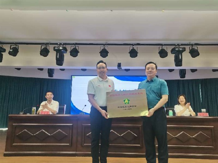 圖為向安鑫體育用品有限公司頒發(fā)“全國殘疾人按比例就業(yè)基地”標牌