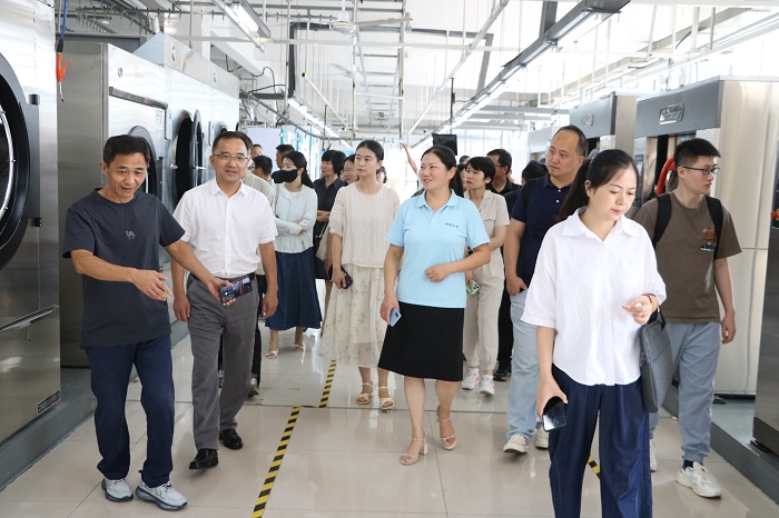 調(diào)研組參觀了沐陽之家5G智慧工廠,實地考察了沐陽洗滌工廠全智能化的洗衣流程和環(huán)保干洗、隧道整形消毒、熨燙整形機(jī)器人等眾多現(xiàn)代化洗滌設(shè)備,并詳細(xì)了解殘疾人和家長就業(yè)情況以及公司運(yùn)營情況。