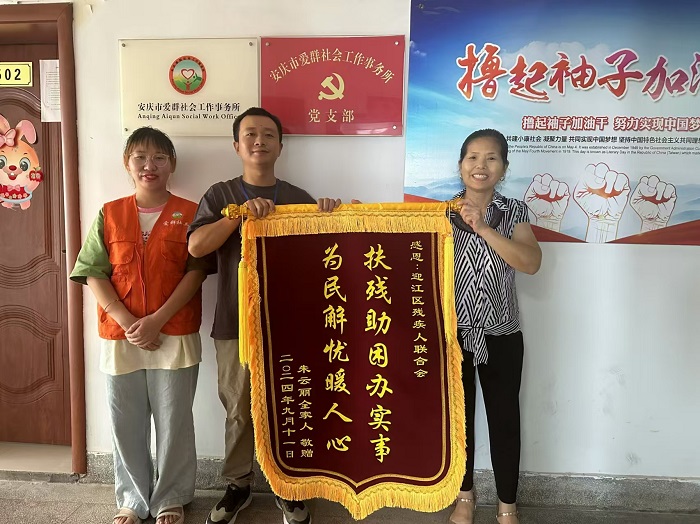 9月11日,迎江區(qū)龍獅橋鄉(xiāng)“陽光家園計劃”居家托養(yǎng)服務(wù)對象小麗(化名)的媽媽來到迎江區(qū)殘疾人托養(yǎng)服務(wù)機構(gòu),將一面寫著“扶殘助困辦實事 為民解憂暖人心 ”的錦旗送給區(qū)殘聯(lián)愛群托養(yǎng)服務(wù)機構(gòu),以此表達她們一家對迎江區(qū)殘聯(lián)所開展的“陽光家園計劃”托養(yǎng)服務(wù)工作的肯定。