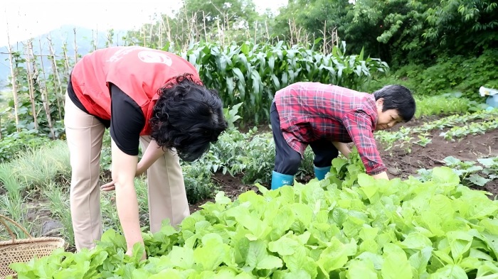 圖為托養(yǎng)機構上門為殘疾家庭摘菜現(xiàn)場
