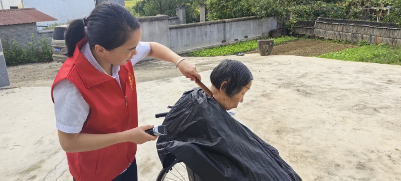 圖為志愿者為殘疾人修剪頭發(fā)
