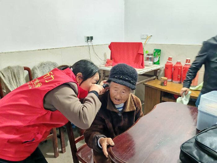 圖為驗(yàn)配師為老人檢查耳道