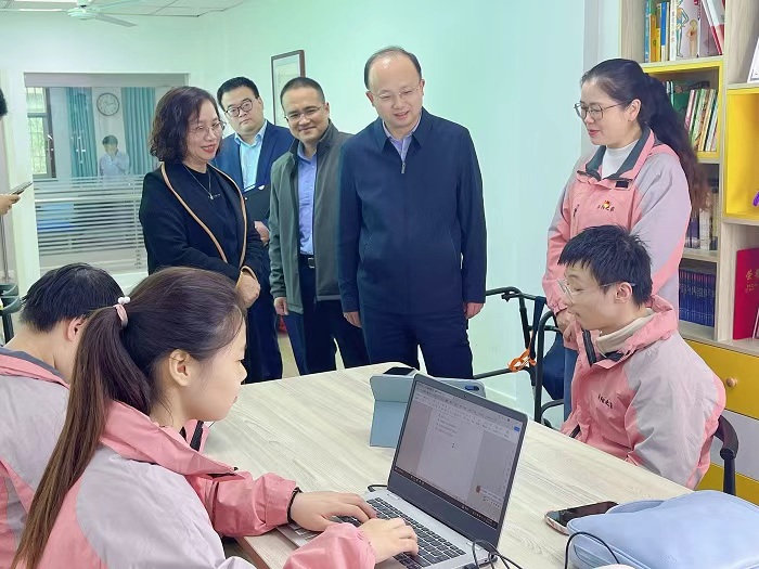 儲(chǔ)江一行實(shí)地察看了康復(fù)機(jī)構(gòu)的康復(fù)、教育、就業(yè)托養(yǎng)等各功能區(qū)域,詳細(xì)了解了在訓(xùn)學(xué)員的康復(fù)進(jìn)展、課程設(shè)置、師資力量以及機(jī)構(gòu)日常運(yùn)營(yíng)管理情況。儲(chǔ)江對(duì)沐陽(yáng)之家多年來(lái)探索實(shí)踐的“康復(fù)、教育、就業(yè)、托養(yǎng)+社會(huì)企業(yè)”一體化服務(wù)模式及其取得的顯著成效給予了高度評(píng)價(jià)。