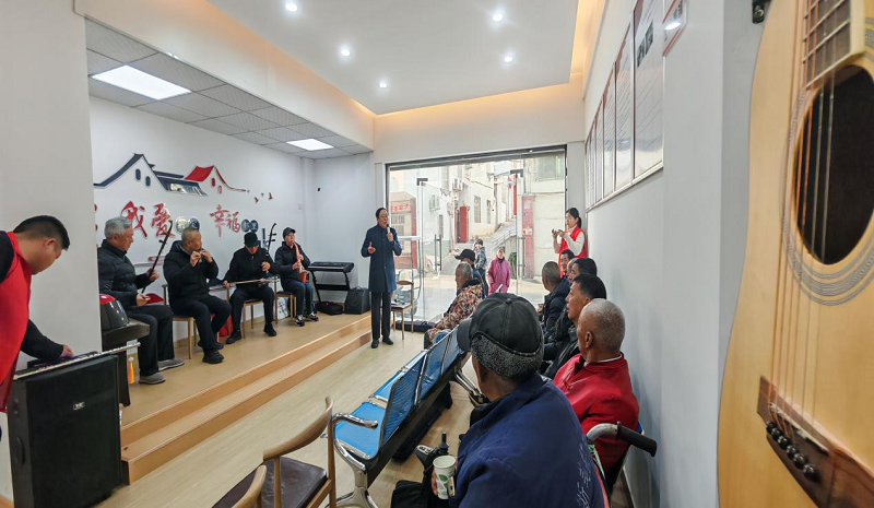 圖為社區(qū)黃梅社團演出