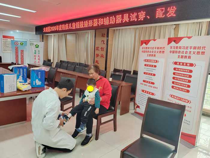 4月10日下午,大觀區(qū)殘聯(lián)開展2026年殘疾人假肢矯形器和輔助器具試穿、配發(fā)工作。本次共有10名肢體殘疾兒童適配了矯形器、矯形鞋,3名殘疾兒童適配了輪椅、站立架等輔具,1名成年肢體殘疾人適配了小腿假肢。